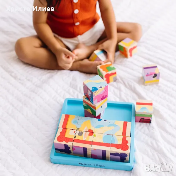 Завъртете кубчета в включената дървена тава, за да завършите цветните картини. (Дизайнът на границата предоставя полезен намек!) Дървените кубчета "Загадките на Блу" от Melissa and Doug насърчават готовността за детска градина, вдъхвайки увереност, спокойствие и доброта у децата в предучилищна възраст, докато развиват своите умения за решаване на проблеми, социални и развиващи умения чрез забавна игра.