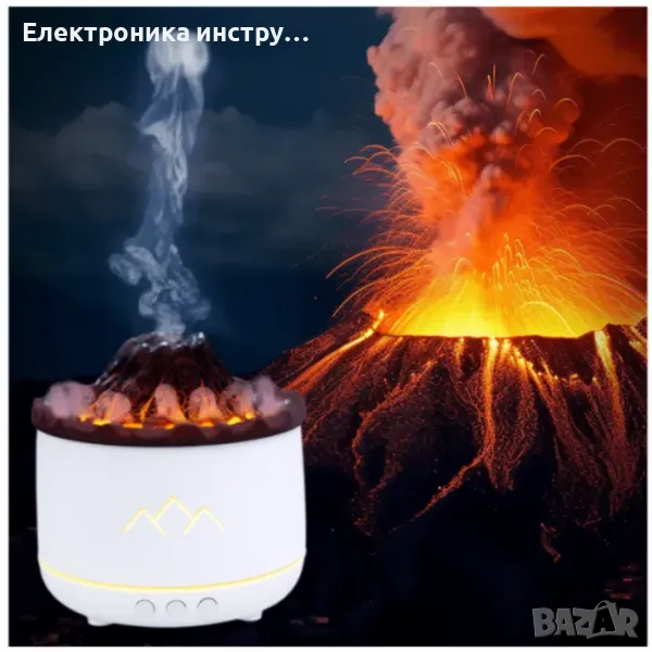 Дифузер с ефект Вулкан: Използвайте като дифузер за етерични масла или овлажнител за стая. Дифузерът използва високочестотна ултразвукова пулверизация и LED светлини, за да симулира ефекта на естествения пламък. Можете да добавите няколко капки етерични масла, за да успокоите тялото и ума си.