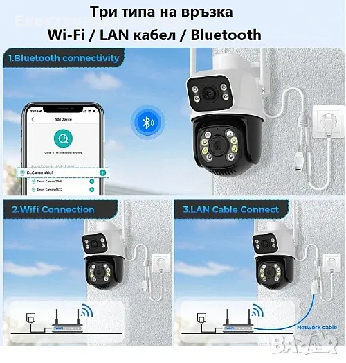 Двупосочно видеонаблюдение – едно устройство но с две камери позволява да 360 градусово наблюдение във всички посоки, БЕЗ риск от скрити действия! PTZ камерата представлява няколко компонента. Стойка, на която се фиксира към стена или греда. На нея е разположена Двойна Wi-Fi камера като горната може да се настройва в желаната от вас посока на заснемане ръчно, след което остава статично по време на заснемане. Долната камера е с 360 градусова ротация (270 хоризонтална и 90 градуса вертикална), която е активна и по време на видеонаблюдение. Това означава, че вие през екрана на телефона си може да насочвате камерата по всяко време без значение дали заснема или не.