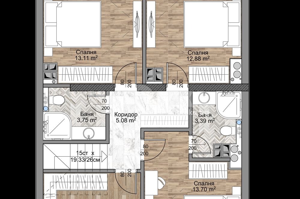 ВЕЧЕ С АКТ 14 Функционален мезонет, разположен на девети и десети етаж. Състои се от: първо ниво: преддверие, хол с трапезария и кухненски бокс с чиста площ 44.51 кв.м., спалня 12.92 кв.м., гардеробно помещение, две санитарни помещения, склад и южна тераса; второ ниво: три спални с чиста площ 13.11 кв.м., 12.88 кв.м. и 13.70 кв.м., кабинет от 10.69 кв.м., две санитарни помещения и тераса. Изложенията са юг, север, изток. Има възможност за покупка на гараж или паркомясто.
