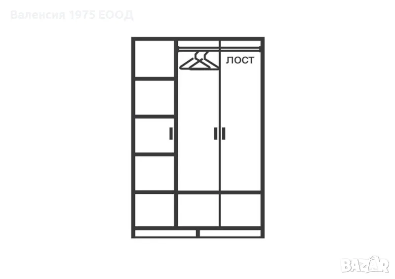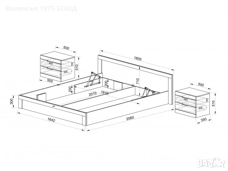 Спалнята е с повдигащ амортисьорен механизъм за матрак 160/ 200 см. Трикрилен гардероб с огледало, четири рафта и лост за закачалки.