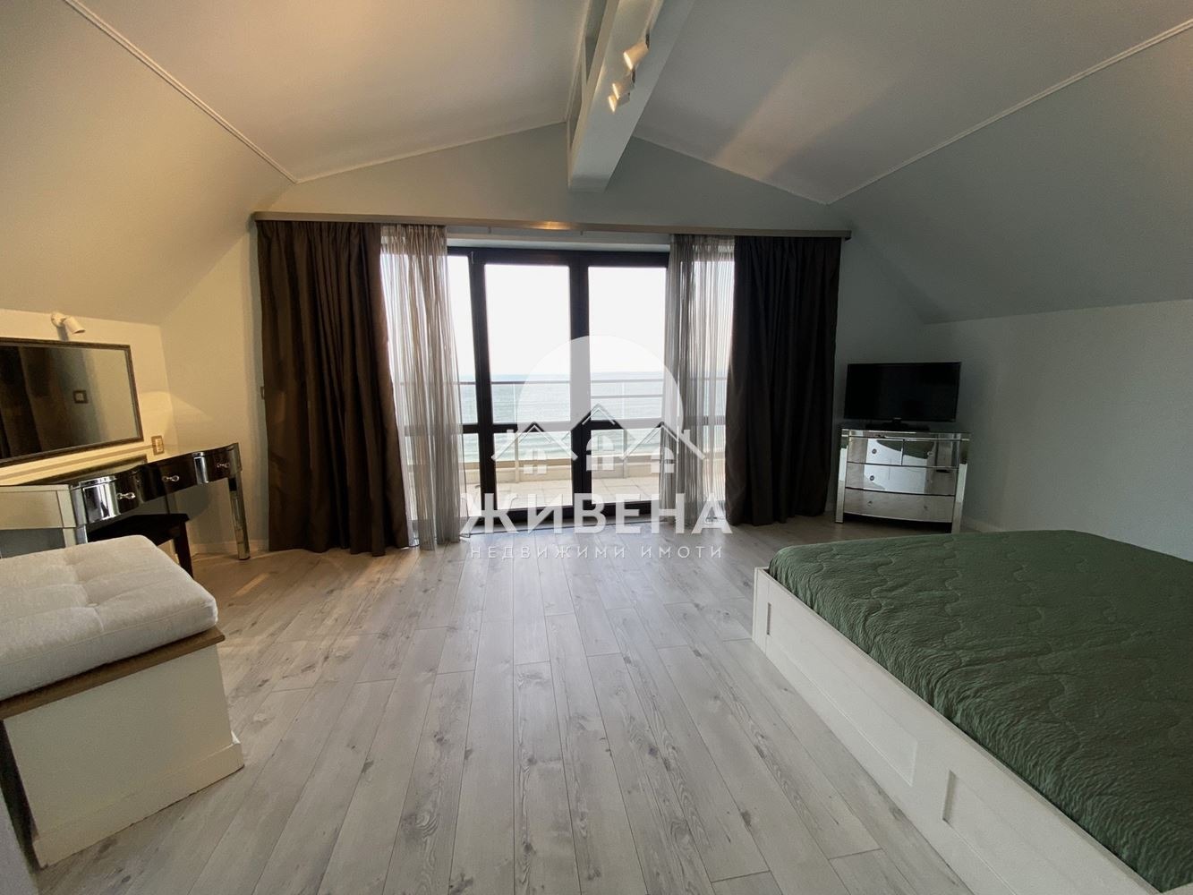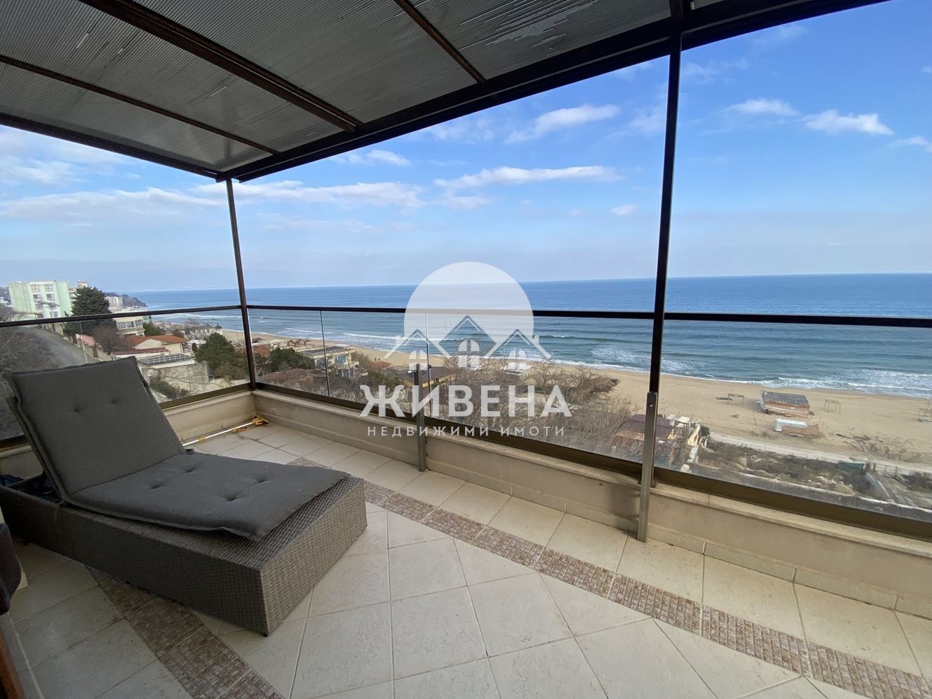 Агенция Живена отдава под наем луксозен 4-стаен мезонет с общо 3 спални, със зашеметяваща морска гледка от всички стаи. Намира се до плаж Кабакум, к.к. Чайка. Разположен е на 5-ти и 6-ти етаж, с обща площ от 255 кв.м, в сграда с контролиран достъп и асансьор. Първото ниво се състои от: входно антре, стълбище, което води до просторна дневна с оборудван кухненски кът, голяма тераса с красива морска панорама, спалня за гости, баня с тоалетна ведно. Стълбището продължава към следващото ниво, където са разположени още две спални (родителска и детска със собствен дрешник), голяма тераса с панорама към родителската спалня, отделно помещение за гардеробна/дрешник, обща баня с тоалетна, душ кабина и прозорец. Предлага се цялостно обзаведен и оборудван с всичко необходимо. Оборудването в кухнята включва следните електроуреди: стъклокерамичен плот и фурна за готвене, аспиратор, съдомиялна машина, хладилник с фризер. Отоплението, респ. охлаждането е изцяло с климатици навсякъде. За паркиране на вашите автомобили са осигурени 2 паркоместа, включени в цената. Такса - поддръжка на общи части, интернет и телевизия са включени в цената на наема. Ток и вода се заплащат отделно за сметка на наемателя. Намира се на комуникативно място, в близост до ресторанти и супермаркети, на пешеходно разстояние от морето и плаж Кабакум.