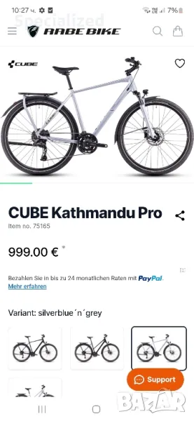 Продавам страхотен велосипед хидравличен модел Cube Kathmandu Pro. Най-висок клас на оборудване (Deore XT). В Bike Center не се предлага. Такова оборудване може да се закупи само в Западна Европа. Размера на рамката е S (50). Подходящ за ръст от 1.60-до 1.75. Възможно е да бъде каран и от дама. Модела е 22-23 г. и е много запазен на външен вид. В момента цената му в Германия след намаление е 999 EUR. Ще направя по-хубави снимки допълнително. Всичко се вижда, но ако има въпроси, ще отговоря.
