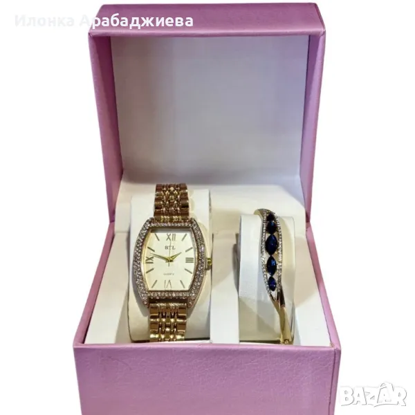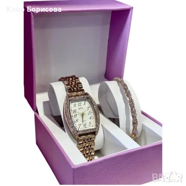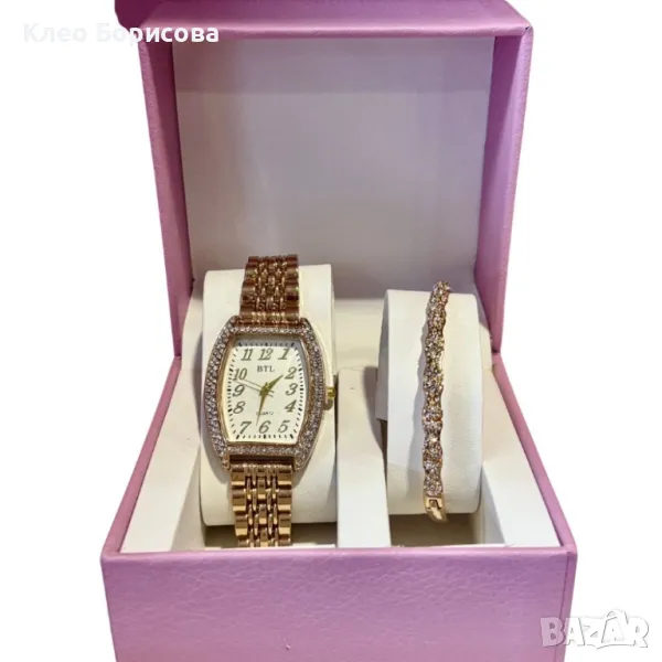 Часовник с арабски цифри, гривна с блестящи камъчета.