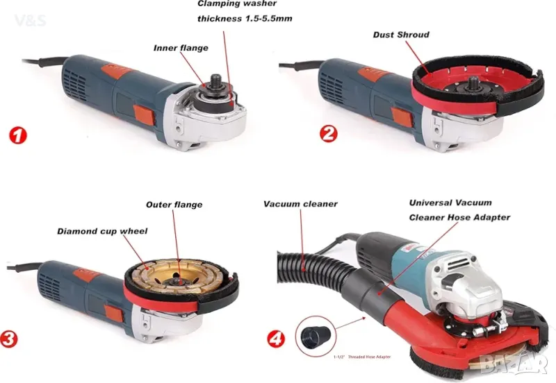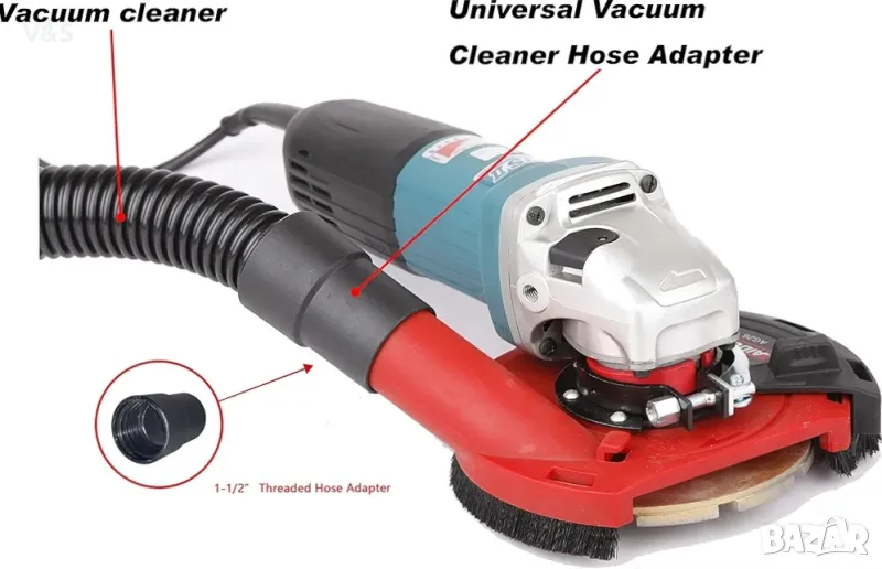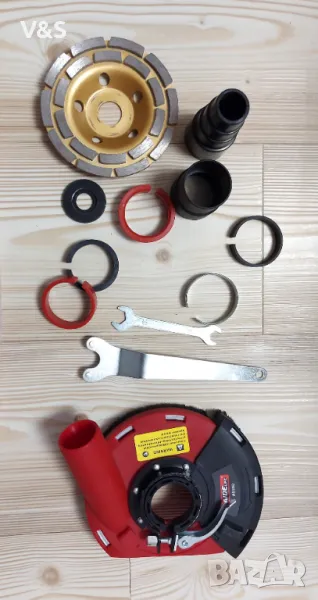 Помощни инструменти: 6 броя затягащ диск с дебелина 1,5-5,5 мм, подходящ за предна капачка на ъглошлайф 39-51 мм. Адаптерът за маркуч с резба 1-1/2" не се разхлабва лесно Стандартният фитинг за маркуч работи с повечето вакуумни системи