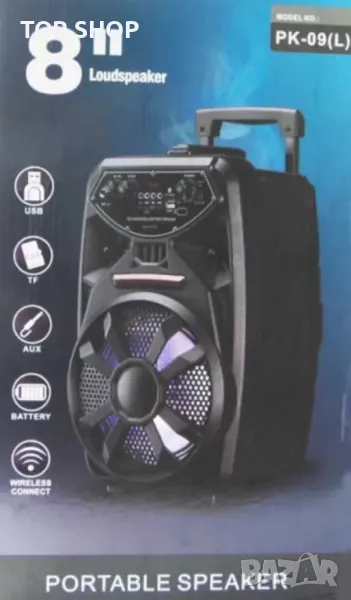 Тонколона PK-09L с вграден усилвател, FM тунер, 1 безжичен микрофон и Li-ion акумулаторна батерия, възможност за запис на USB флаш.