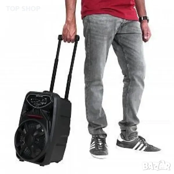 Вход за допълнителен микрофон с EXO ефект и регулировка на усилването, линеен стерео 3.5mm AUX вход, Bluetooth. Disco Light. Диаметър на нискочестотния говорител 8".