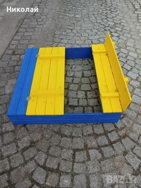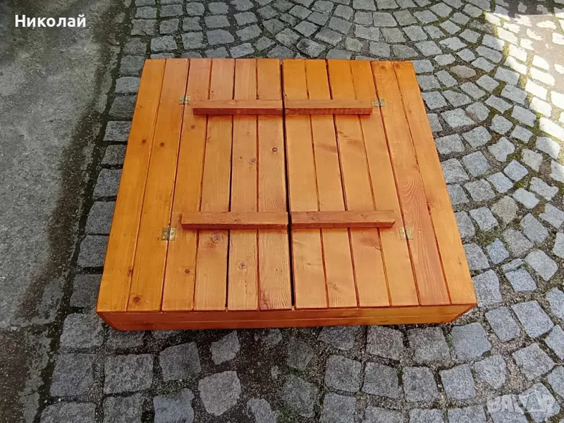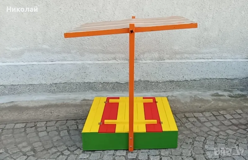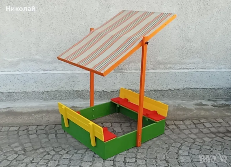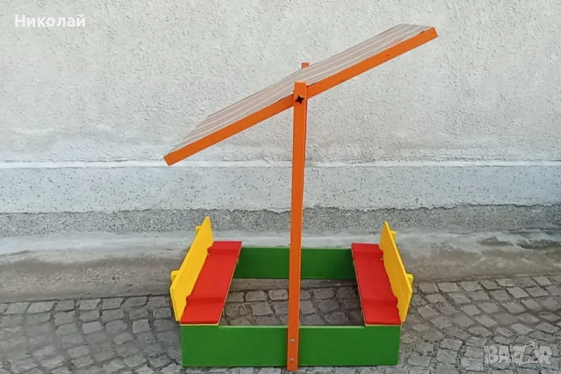 Детски пясъчник със сенник изработен от дърво със сгъваеми пейки. Сенникът може да се регулира по желан от вас наклон или да се премахне. Пясъчникът е с две пейки за деца с панти и щом се затворят предпазват пясъкът от котки, жаби и други замърсявания. Дървото е обработено с импрегрант и боядисано с боя на водна основа.