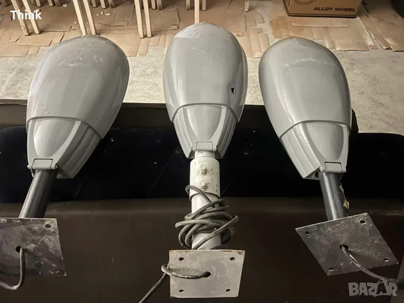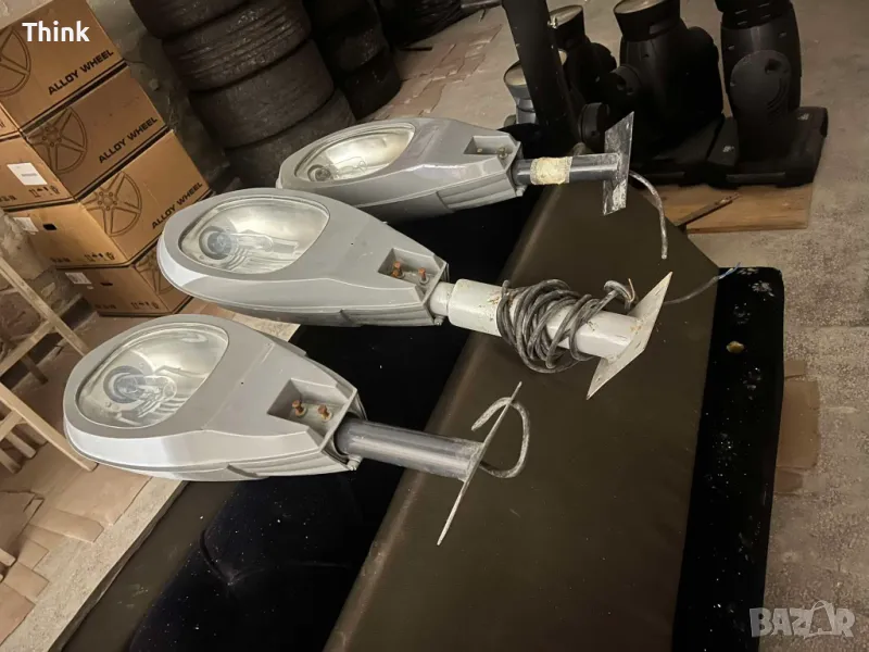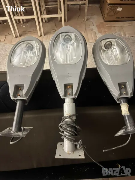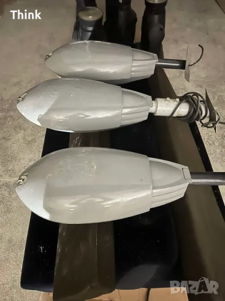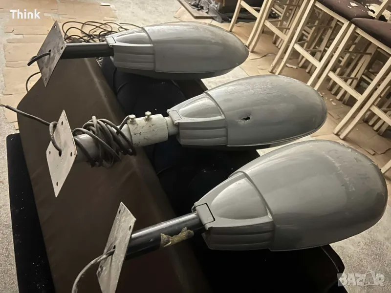 Външни улични лампи с крушки.Цената е за един брой,мощността е 250w.Ползвани са,но работят без проблем.Продават се с готови стойки за монтаж.