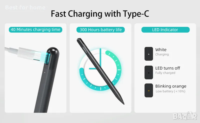 Бързо зареждане с Type-C, 40 минути за 300 часа живот на батерията