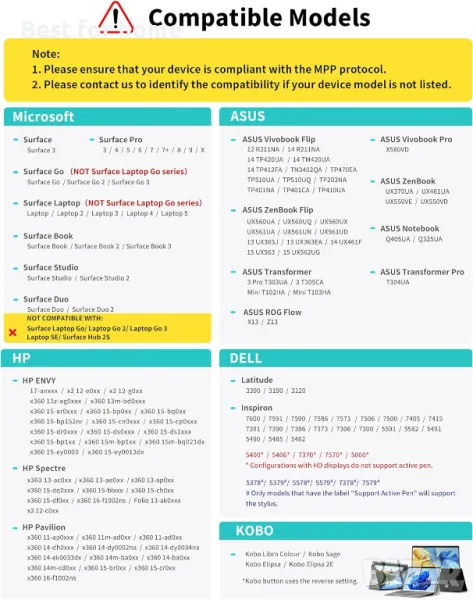 с модела, ако не сте сигурни за съвместимостта. M1 поддържа до протокол MPP1.15, съвместим с повечето повърхности на Microsoft и някои модели от HP, ASUS, DELL, Acer, SONY и ViewSonic. [Списък с модели на Surface] ✔Surface Pro 3/Pro 4/Pro (5-то поколение)/Pro 6/Pro 7/Pro 7+/Pro 8/Pro X, ✔Surface Book/Bk 2/Bk 3, ✔Surface Laptop/Laptop 2/Laptop 3/Laptop 4/Laptop Studio, ✔Surface 3, ✔Surface Go/Go 2/Go 3, ✔Surface Studio/Studio 2