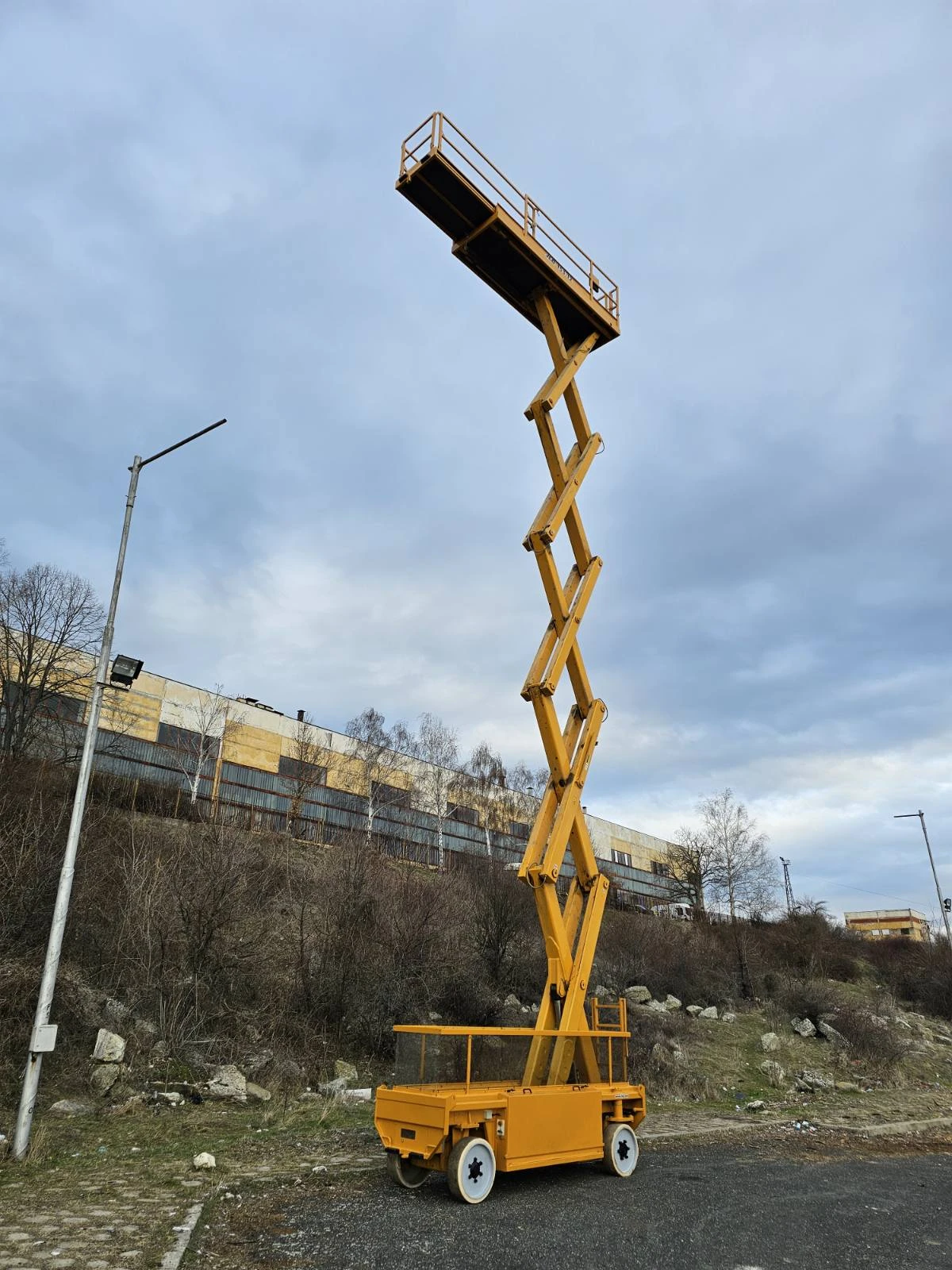 Нов внос. Отлично състояние. Техническа документация. Управление от коша и шасито. Бели гуми. Широка е само 1, 2 м. Подходяща за работа в тесни помещения. Възможност за гаранция и сервизно обслужване. 17, 3 м- работна височина 1, 2 м- обща ширина 4, 12 м- дължина на платформата 5, 61 м- дължина с удължението на платформата 7145 кг- собствено тегло