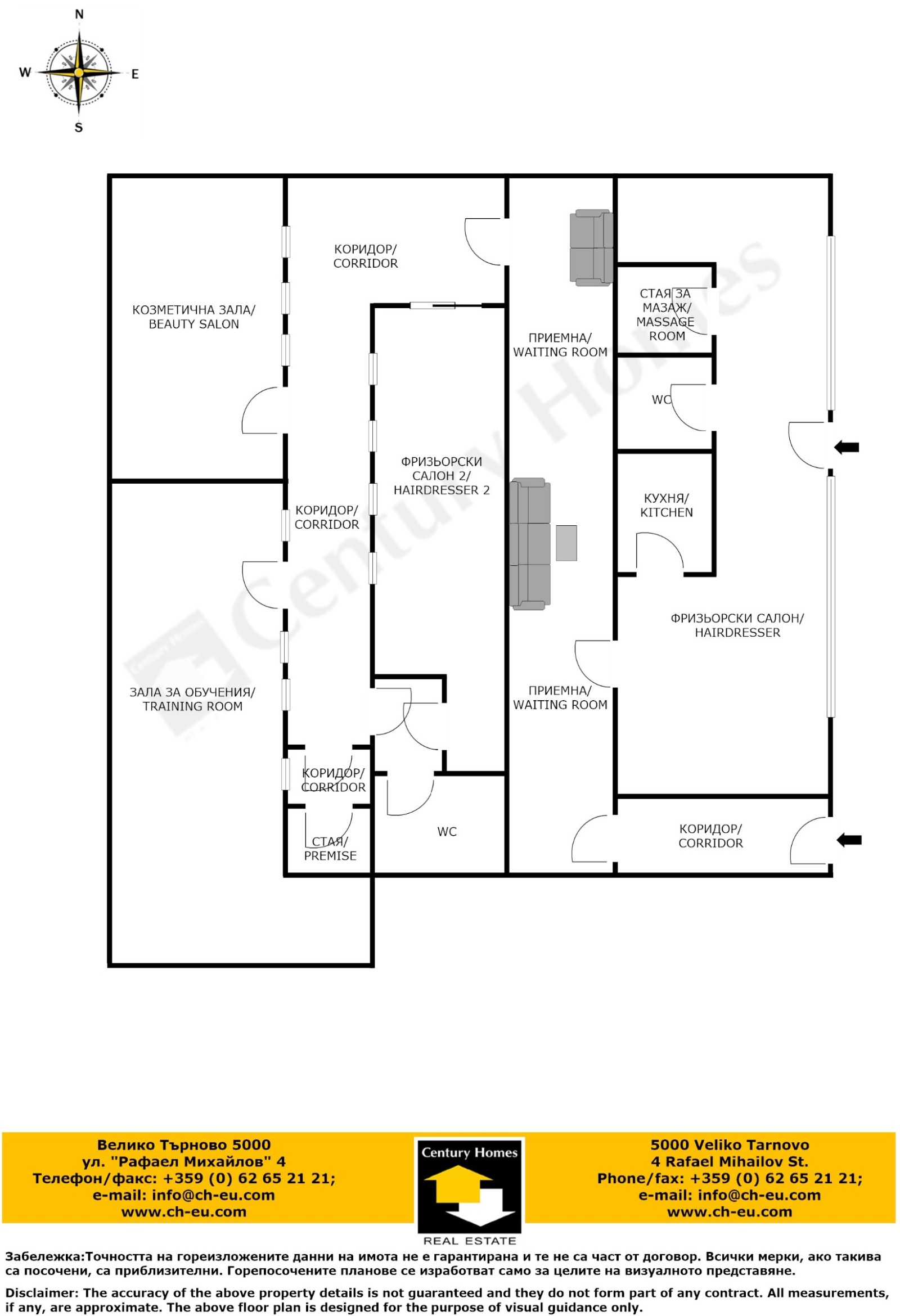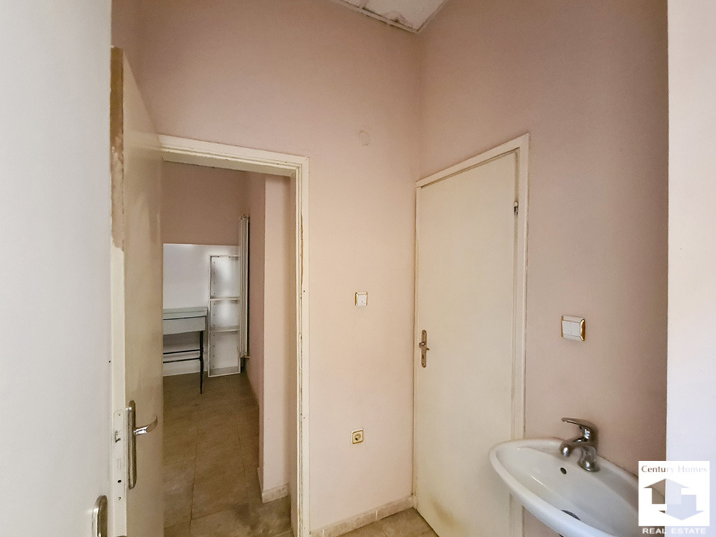Предлаганият за продажба имот се намира в оживения квартал Бузлуджа, във Велико Търново. Разположен на ниво тротоар, в тухлена сграда и с площ 184 кв. м., имотът разполага с два входа с източно изложение. Вътрешното разпределение включва входно антре, коридор, 4 големи зали, две санитарни помещения, малка кухня и две помощни помещения.