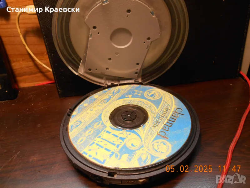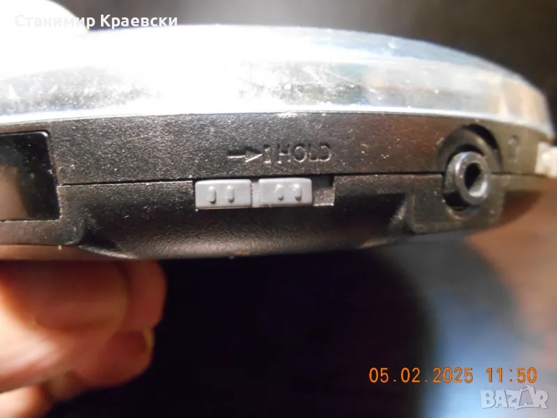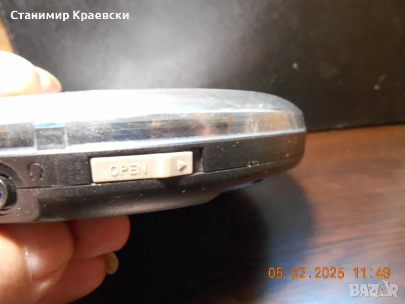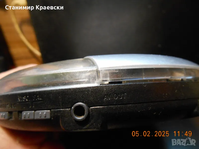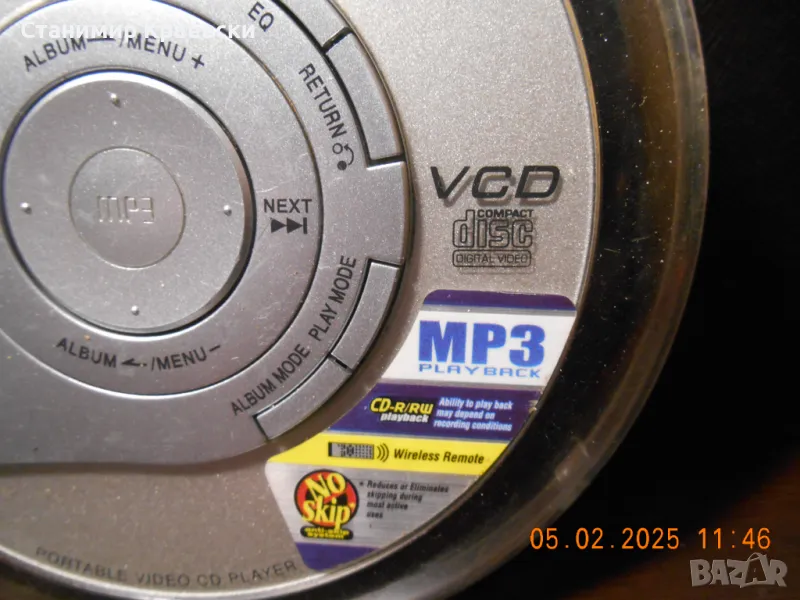 Работещ дискмен с видео функция VCD Има много чертички по корпуса навсякъде и липсва капачето на батерийте Джоба обаче е направен така че батерийте да не падат Има и буферна памет 100 сек против прескачане на диска Поддържа и дистанционно но го няма Модела е от среден клас и не бива да се бърка с началните класове дискмени