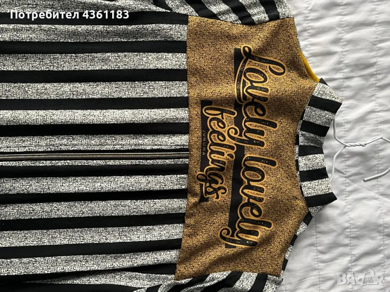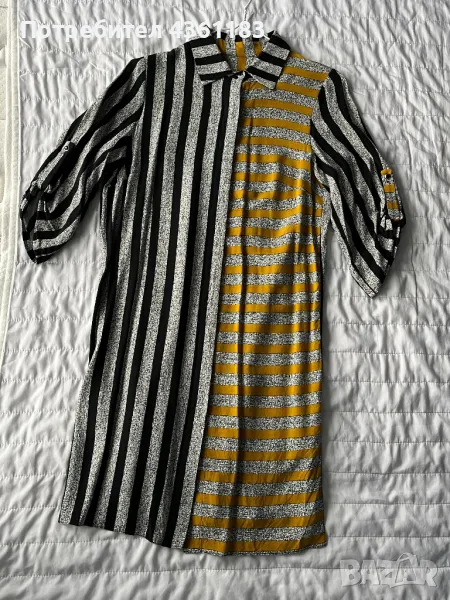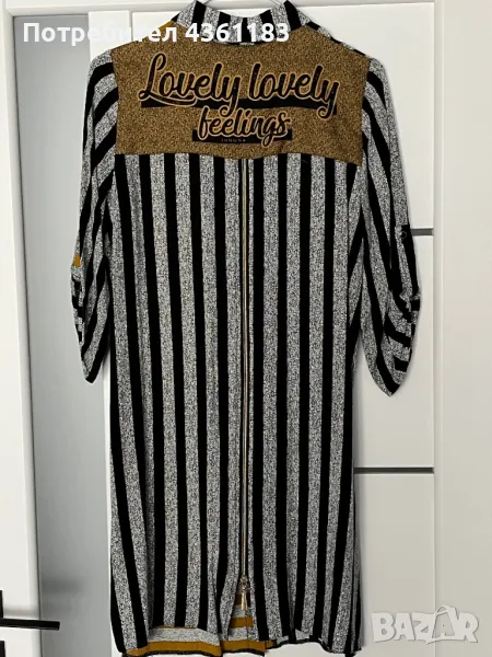 Нестандартна риза на Junona, размер S. Закопчаването е със скрити копчета отпред, ръкавът е 3/4. Моделът е с дължина над коляното, има цепки от двете страни. Невероятен акцент на гърба - широк надпис и цип от плешките до долу.