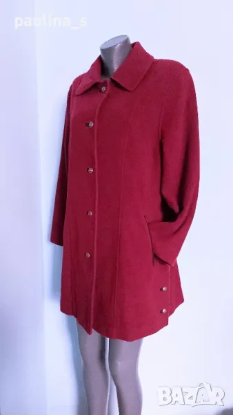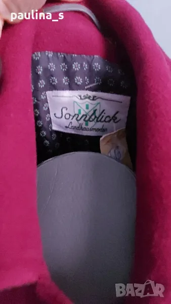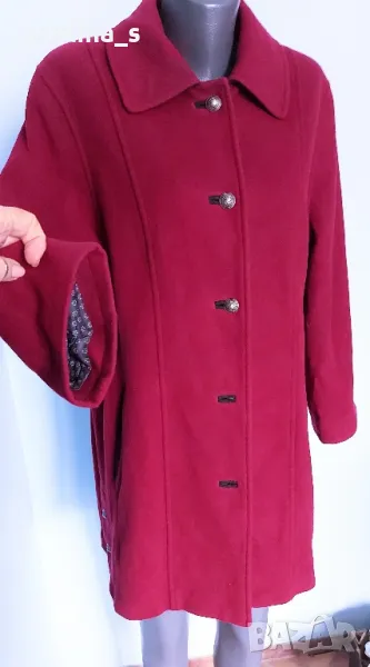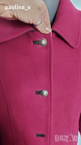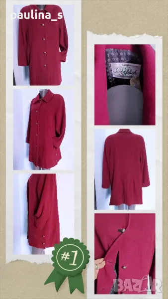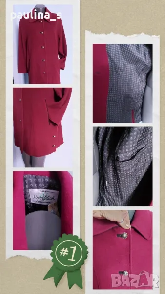1️⃣. Колаж / L / 2XL "Sonnblick landhouse". Цената е 89,99лв / 45 евро. Много рядка находка! Палто с високо съдържание на вълна и кашмир. Моделът е с А силует, разкроението идва от платките на гърба. Илиците и джобовете са обазовани - ръчна изработка. Копчетата са релефни и сферични, контрастират прекрасно. Има цепки в страни, обла яка, пъстър хастар. Платът е пухкав и мек на допир до кожата. Цветът е малинено червен, камерата не може да улови красотата на дрехата. Уникат!