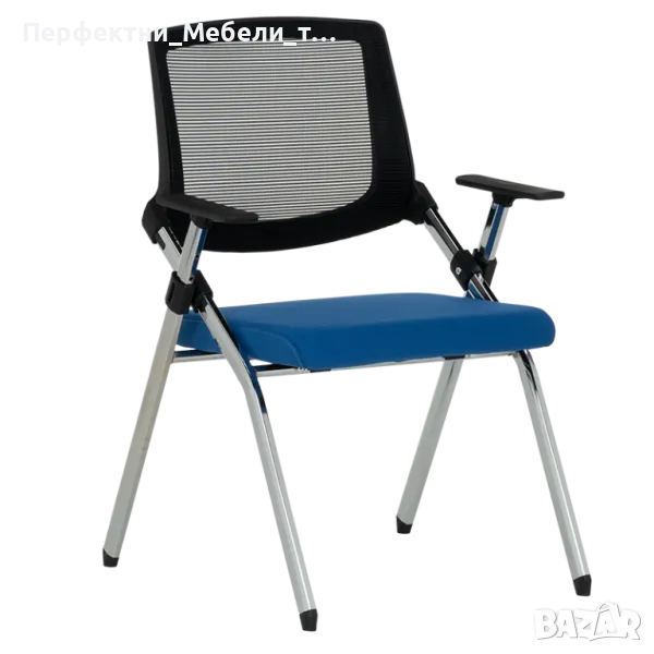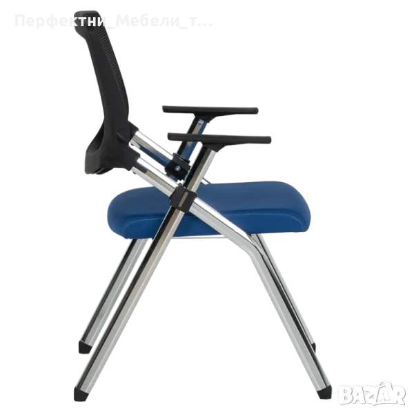 Сгъваем посетителски стол със синя еко кожа на седалката и подлакътници за конферентна зала,за концертна зала,за театрална зала,за църковна зала-цена за брой 144.00 лв с ДДС - доставка до 2 работни дни.
