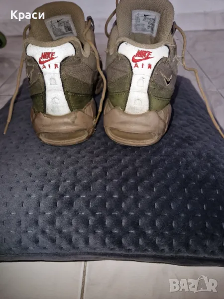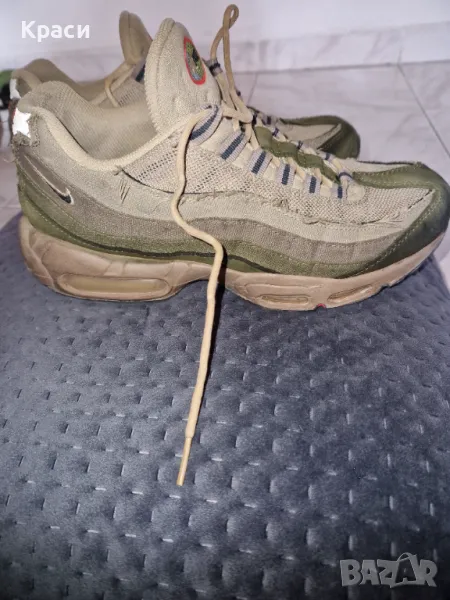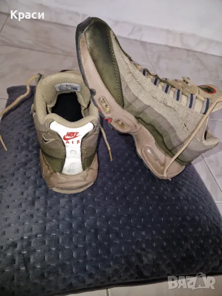 Продавам чифт оригинални Nike Air Max 95 в бежово-зелена цветова гама. Маратонките са използвани ,удобни и подходящи за ежедневно носене със запазени въздушни камери.