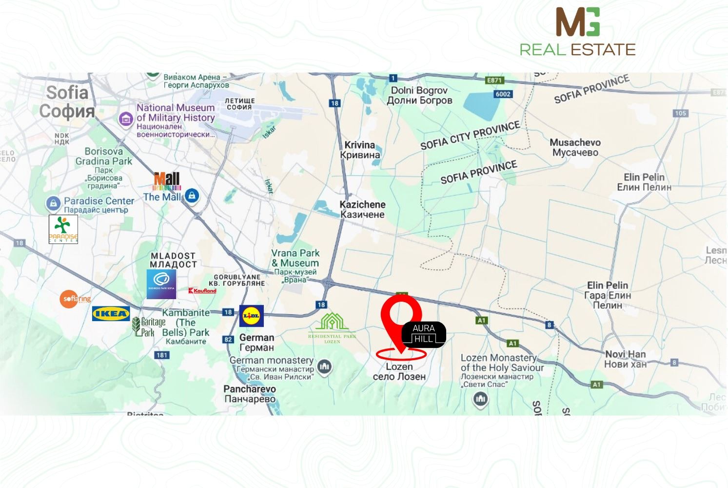 MG Real Estate представя AURA HILL съвременна жилищна сграда, разположена в село Лозен, район Панчарево , на ул. Детелина 24. Съчетанието между природна идилия и бърз достъп до столицата прави това място идеалното решение за съвременния човек, търсещ баланс между динамиката на града и уюта на спокойния живот.