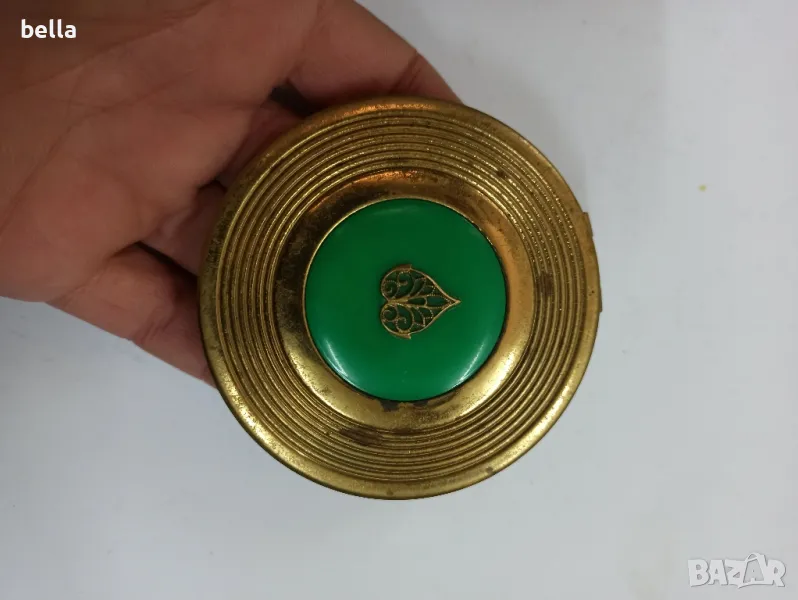 Стара антикварна месингова табакера с красив голям красив зелен камък и нежно листо ,цена 120 лв