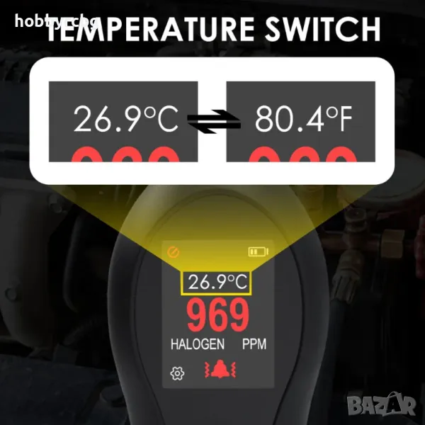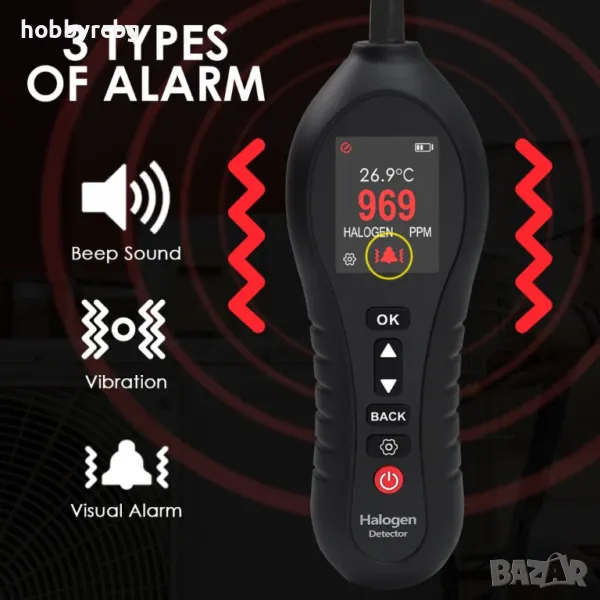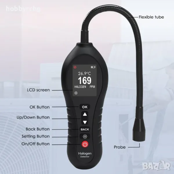 до 1000 ppm, за откриване на Фреон, Халон, Хлор, Флуор, Етилен оксид,
