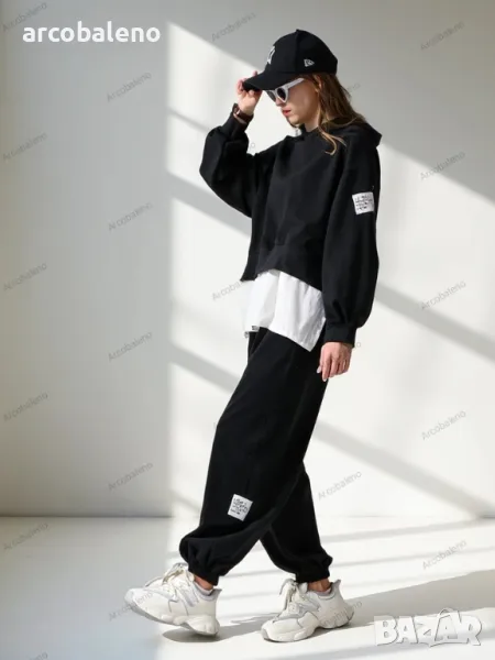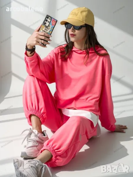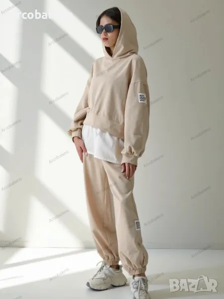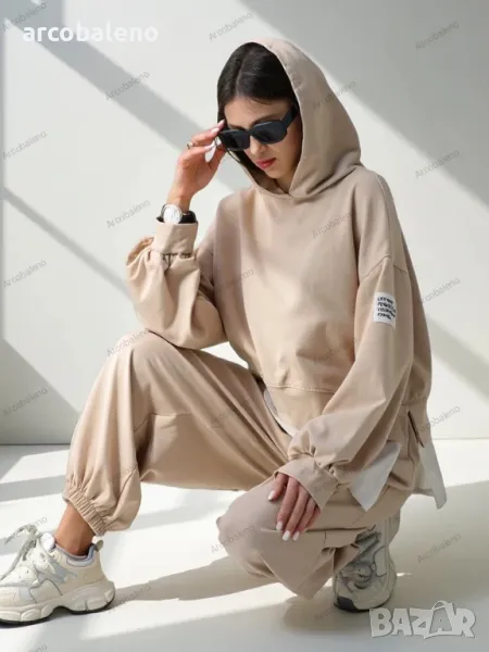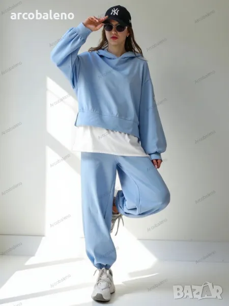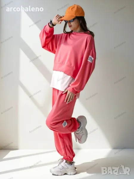 Ежедневен дамски комплект от приятна материя. Суитшърт се облича през главата, има дълги ръкави и панталон с 2 джоба, ластик на талията и крачолите. Перфектен за тези, които ценят комфорта.