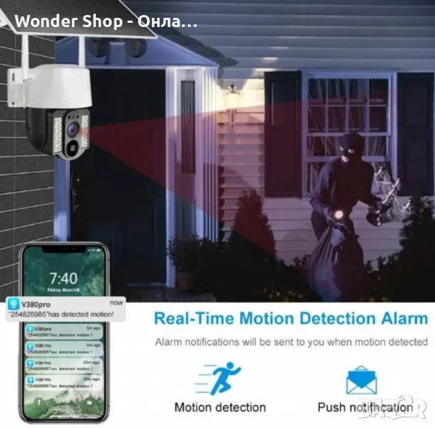 Резолюция: 8MP, 3840x2160 (4K) за кристално ясни видео изображения с висока детайлност; Датчик за движение: Интелигентен сензор, който задейства запис и известяване при засичане на движение; Нощно виждане: Инфрачервен LED обхват до 20 метра за надеждно видеонаблюдение през нощта; Вградена батерия: Осигурява продължителна работа дори при липса на слънчева светлина или захранване чрез USB; Слънчева мощност: 5W соларен панел, който поддържа работата на камерата през целия ден; Водоустойчивост: Степен на защита IP66, устойчива на дъжд, прах и тежки климатични условия; Вграден високоговорител: 3W мощност за силен и ясен звук, използван при двупосочното аудио; Приложение: Поддръжка на V380 Pro за лесно управление и наблюдение от разстояние.цена:144.99лв