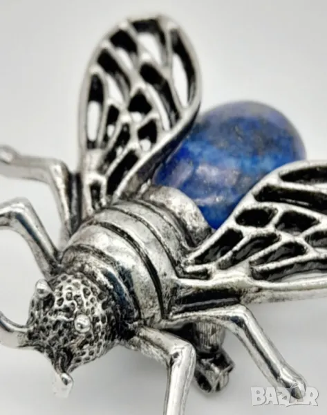 Комплект бижута от лапис лазули, състоящ се от колие с три реда нанизи, гривна, чифт сребърни обеци с проба 925, пръстен и декоративна брошка пчела. Приблизителни размери: колие 21 см, гривна 19,5 см, обеци 4,2 см, размер на пръстена Q 1/2.