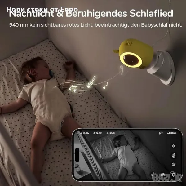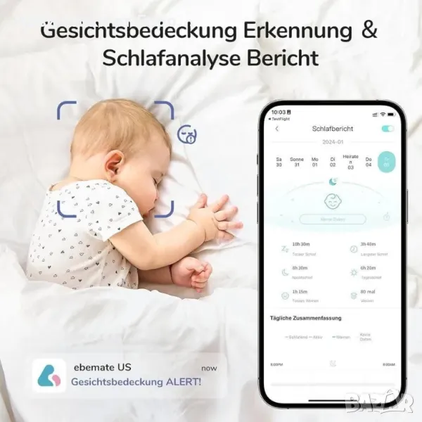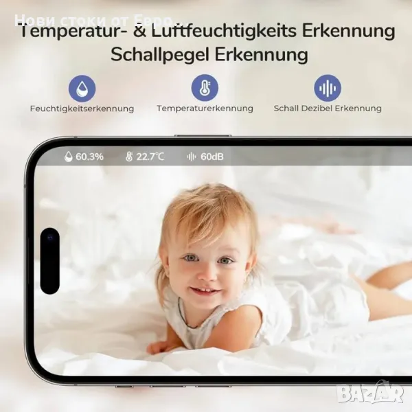 jeeber 2.5K/4MP бебефон с камера - няма ограничения на разстоянието, наблюдавайте бебето си навсякъде с мобилен телефонИнтелигентно напомняне с изкуствен интелект - винаги свързано, винаги безопасно: Изживейте модерното родителство със свобода и безопасност за вашето бебе. Интелигентен бебефон с камера има функция за разпознаване на плач. При плач веднага се пуска приспивна песен за успокояване на бебето. Усъвършенстваният AI открива рискови поведения, като покриване на лицето и сън на стомаха, и позволява навременна намеса за предотвратяване на опасност от задавяне. Професионалната грижа освобождава новите родители. Безгрижен сън - наблюдение и анализ на съня на бебето: В света на родителството бебето спи добре, означава също, че вие спите добре. Изключителният алгоритъм на сензора за дишане на бебефона анализира циклите на дълбок/лек сън на вашето бебе и ги комбинира с персонализирана, успокояваща музика и нежна нощна светлина, за да гарантира, че вие и вашето малко дете се наслаждавате на добър сън и спокойна почивка. Интелигентно удобство – смартфон, смарт часовник и таблет: модерна технология на китката. Независимо дали сте у дома, в друга стая или в движение, можете удобно да наблюдавате безопасността и здравето на вашето бебе от вашия телефон или смарт часовник. Подобреното качество на изображението 2.5K ви позволява ясно да уловите всяко малко движение и изражение на лицето на вашето бебе. *Ограничен от мощността на батерията на смарт часовника, часовникът предоставя само изображения в реално време вместо видеоклипове. Ексклузивен бебешки експерт - проследяване на движението, предпазна ограда и измерване на влага/температура: Бебефонът Jeeber с камера може да следи състоянието на движение на вашето бебе по всяко време и да регулира зоната на безопасност, независимо къде се намирате. Получавайте незабавни известия, когато вашето бебе премине безопасната граница. Освен това, за максимален комфорт, можете да следите влажността и температурата в заобикалящата бебето среда по всяко време. Безплатни премиум функции - бебефон с камера и приложение: Насладете се на двупосочен звук в реално време, автоматични моментни снимки, неограничено споделяне на акаунти и персонализирана мозаечна защита на данните, всичко това без абонамент. Със сертификат Rohs, покритието е меко и безопасно и може безопасно да се постави около бебето. ***JEEBER предлага 90-дневно безплатно връщане и замяна, както и 3-годишна гаранция за всеки бебефон, позволете си да купувате с увереност!