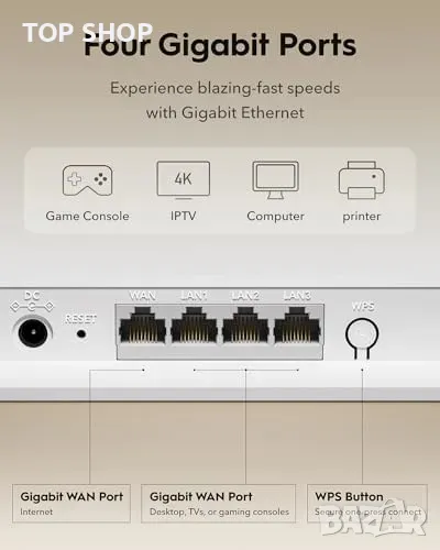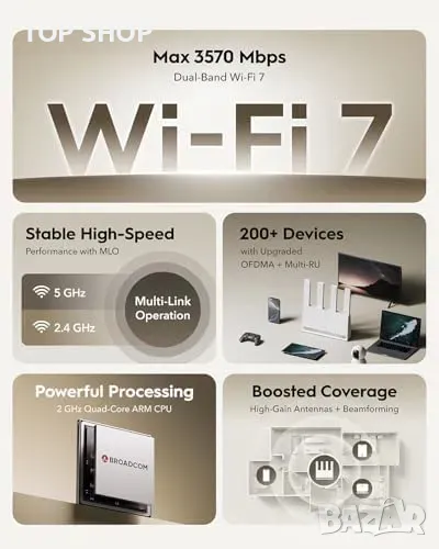Двойнолентов Wi-Fi 7 – до 3.6 Gbps (2882 Mbps @ 5 GHz + 688 Mbps @ 2.4 GHz)