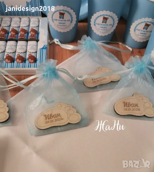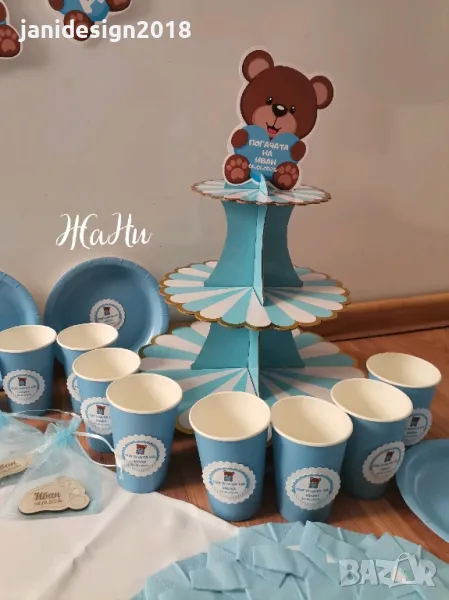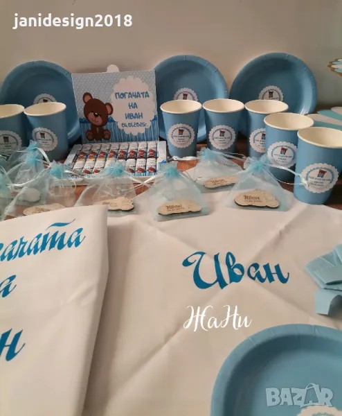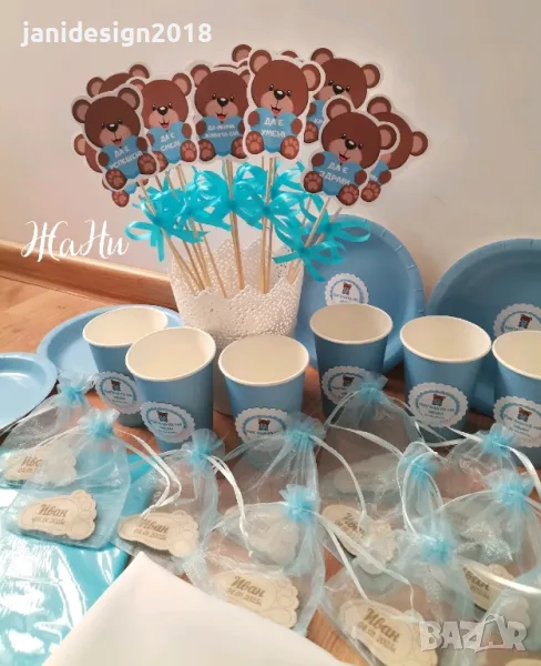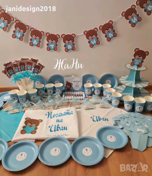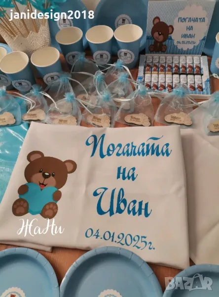 Комплект за погача на тема Мечета*месал за разчупване на питката с името на детето и датата на празника*малка кърпичка за паричките с име*бонбони с дизайн съобразен с темата на празника*чаши*чинийки*салфетки боди*стойка за мъфини*магнити крачета за хладилник подаръчета за гостите*