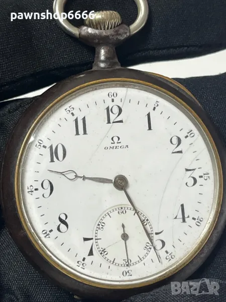 Omega с отворен циферблат , произведен в Швейцария през 1900 г. ЦИФЕРБЕЛТ: Белият емайлиран циферблат има черни арабски цифри с деления на външните минути и червени външни числа от 13-24 часа. Циферблатът е подписан: “OMEGA” с логото и има допълнителен секунден циферблат при шестицата. ДВИЖЕНИЕ: Петнадесетте скъпоценни камъка, механизмът с лост за спирачка има обикновен кран с полиран стоманен регулатор и синята стомана върху спирална пружина. Механизмът е подписан: „Омега“ и номериран: 5148999. Механизмът е в добро работно състояние, но не можем да гарантираме точността за старинен часовник. КАЛЪФ: Часовникът се намира в метален корпус с гладко покритие. Вътрешната страна на кутията е подписана Omega и номерирана: 5685799. Подписана: Omega Диаметър: 51 mm – Тегло: 93,14 g.