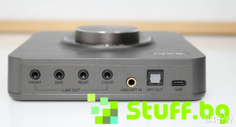 Свързаност: IN: 1 x 3.5mm (microphone), 1 x 3.5mm Line/Optical In, 1 x USB-C / OUT: 4 x 3.5mm (front, side, rear, central speaker / subwoofer), 1x3.5-mm (headphones)