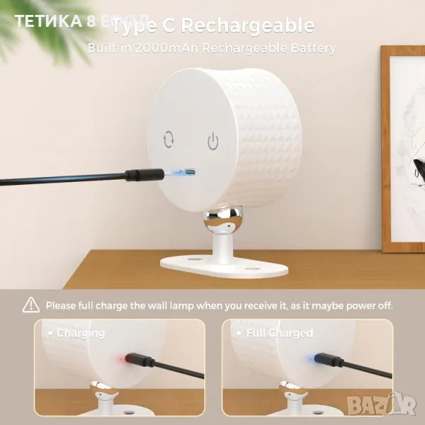 Стенна лампа с акумулаторна батерия: тази стенна лампа без захранваща връзка е оборудвана с акумулаторна батерия от 2000 mAh (включен USB-C кабел за зареждане). Безжичната стенна лампа може да работи до 18 часа в най-слаб режим след пълно зареждане за около 3-4 часа. Червената светлина светва, за да ви напомни за зареждане или зареждане. Синята светлина ще светне, когато лампата за безжична връзка е пълна. (Забележка: моля, заредете напълно стенната лампа, когато я получите, защото беше изключена.)