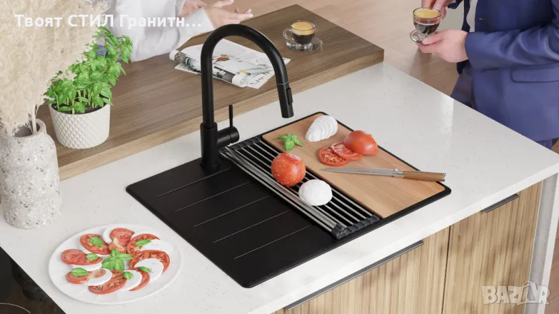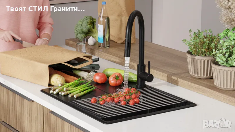 Тази гранитна кухненска мивка е оборудвана с практичен вграден отцедник, който: