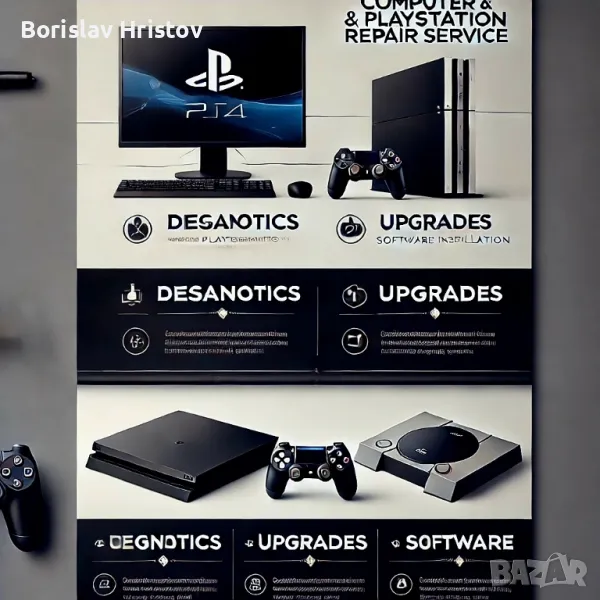 Предлагам качествени услуги по ремонт и поддръжка на компютри, лаптопи и PlayStation конзоли.✅ Ремонт и диагностика на настолни и преносими компютри✅ Профилактика – почистване от прах, смяна на термопаста, подобряване на охлаждането✅ Ъпгрейд – подмяна на RAM, SSD, видеокарти и други компоненти✅ Инсталация и преинсталация на Windows, драйвери, софтуер✅ Отстраняване на софтуерни проблеми – вируси, грешки, забавяне на системата✅ Ремонт и сервиз на PlayStation – софтуерни и хардуерни проблеми⚡ Качествена работа на достъпни цени!За въпроси и записване:0877760044Работя в София възможност за посещение на адрес!Свържете се с мен и върнете устройството си към пълна функционалност!