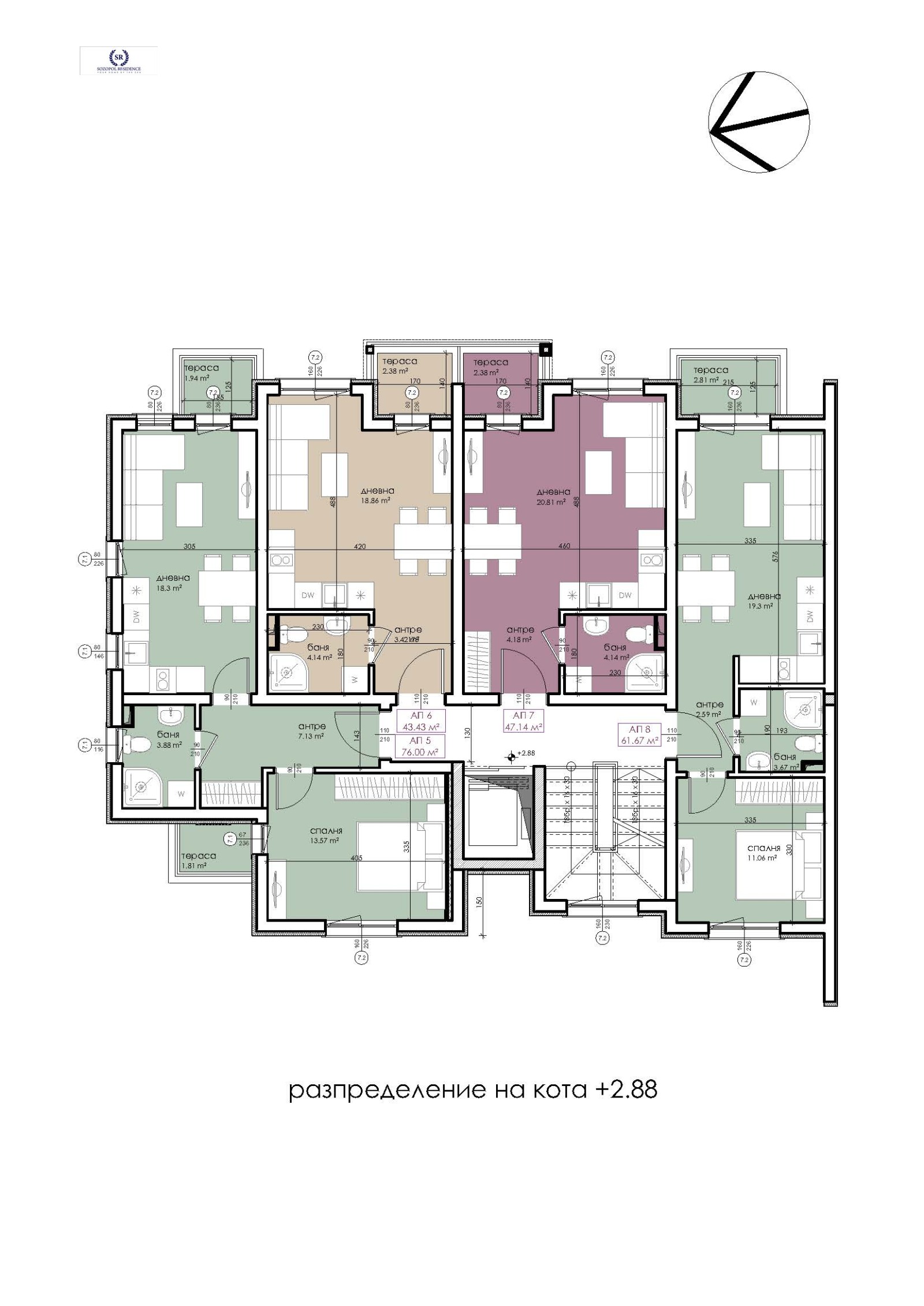 Апартаментът се състои от коридор, баня с тоалетна, спалня, дневна с трапезария и кухня, тераса и частен двор - 17 кв.м. Има 2 изложения: изток (с гледка към морето от верандата) и запад. Планировката на апартамента можете да разгледате на: https://sozopolresidence.com/sgrada-fortune/prodazhbi/etazh-ii/apartament-4/