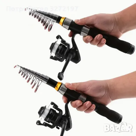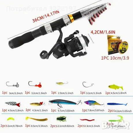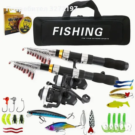 Този комплект риболовни принадлежности включва 2 телескопични въдици, 2