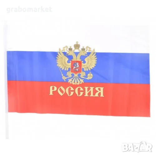 Руския флаг в размери 30 х 45 см. с дръжка. Произведено е от полиестер.