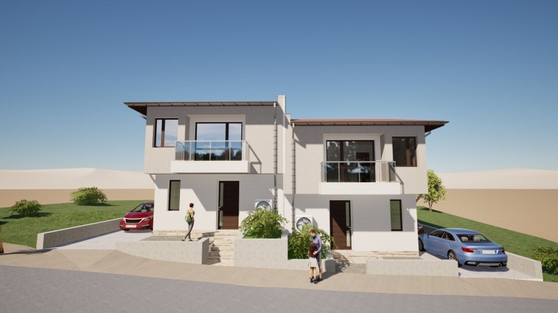 Имотът се намира на тихо и спокойно място, във високата част на м.Мисаря, на главен път! В имота са предвидени 2бр. самостоятелни двуетажни къщи със самостоятелно дворно място и 2бр. паркоместа към всяка къща!