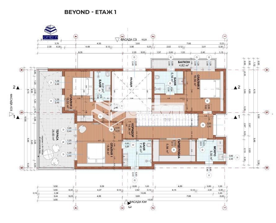 - на първия етаж са разположени три големи спални, всяка от която със самостоятелна баня с WC. Всички спални имат излаз на просторен балкон, откриващ впечатляваща гледка към морето. На етажа има допълнително голямо помещение, предвидено за гардеробна и още едно мокро помещение.