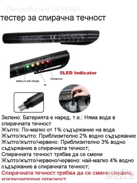 Тестерът може да се използва като цифров тестер за спирачна течност, подходящ за определяне на качеството на спирачната течност. Разработен за професионална употреба в автомобилни сервизи Качеството е тествано и включено в пет светодиода по отношение на "процент вода в спирачната течност".