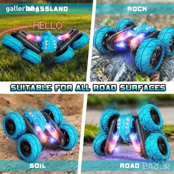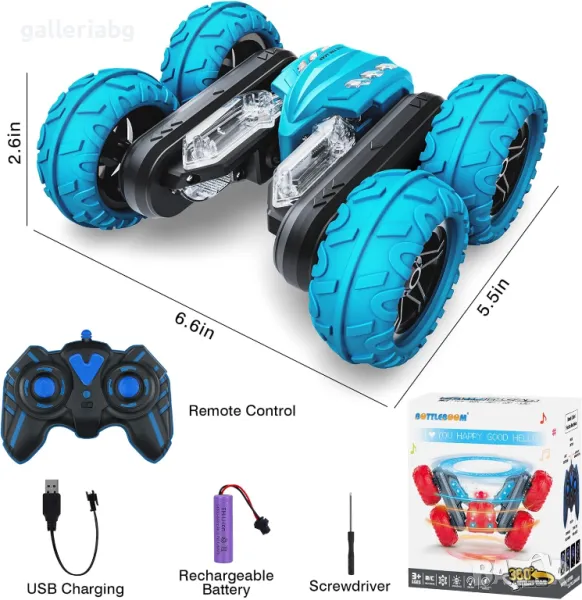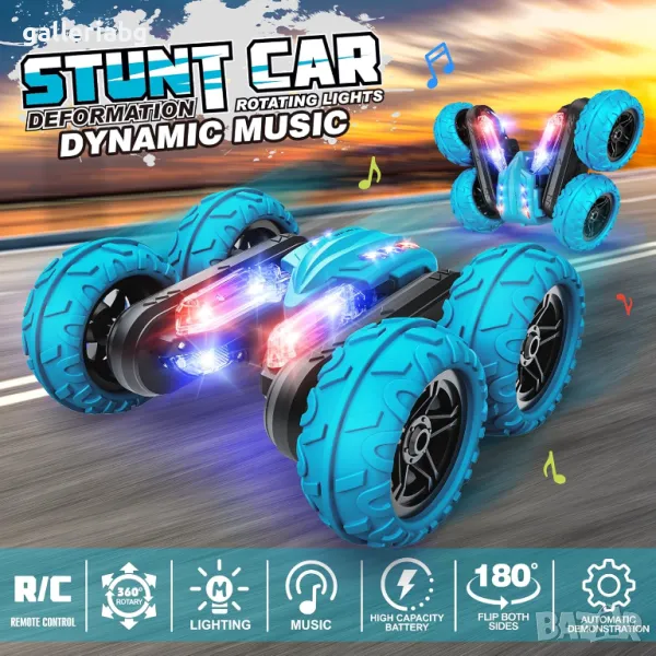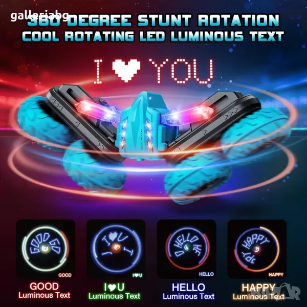 Кола с дистанционно управление 2.4 Ghz R/C каскадьорска кола. Двустранно въртене на 360 градуса. Играчка кола акумулаторни LED светлини.