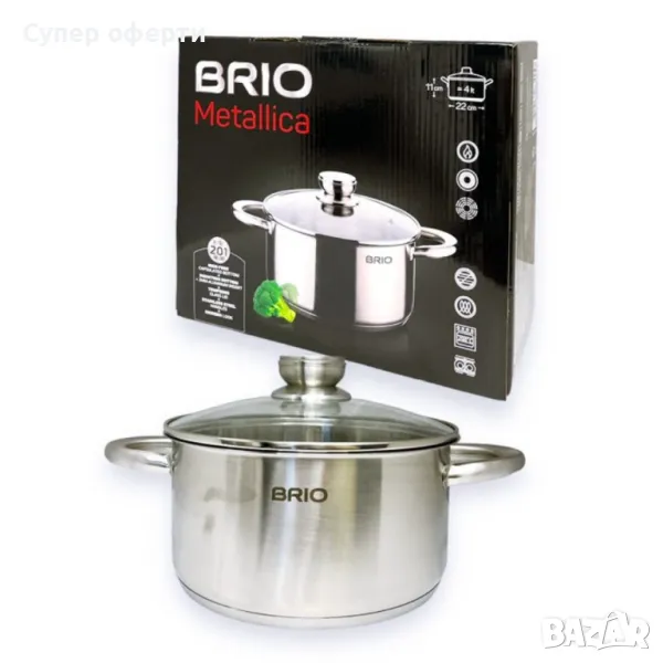 Тенджера Brio Metallica от неръждаема стомана, Ф22см х 11см/4л, снимка 1 - Съдове за готвене - 49212884 Тенджера Brio Metallica от неръждаема стомана, Ф22см х 11см/4л, снимка 2 - Съдове за готвене - 49212884 1/2