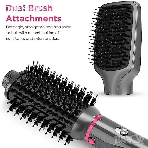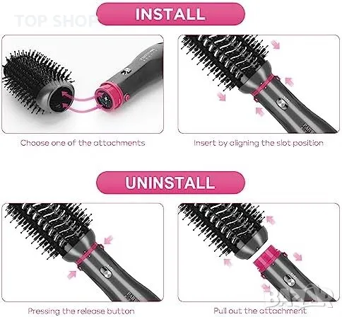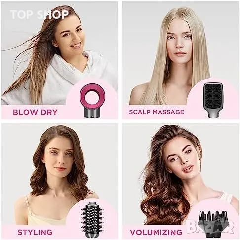 Комплектът включва 4 приставки за стилизиране, които могат лесно да се сменят с помощта на бутона на дръжката. Тези приставки ви позволяват да използвате устройството като дифузер за къдрава коса, сешоар, гореща четка и др. Тази функция осигурява многофункционалност и опростява почистването на стилизиращите аксесоари.