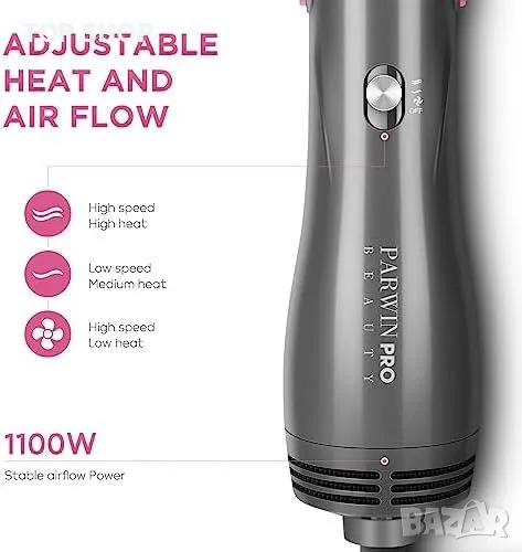 Четката за горещ въздух разполага с вграден 1000-ватов мотор с 3 степени на нагряване и 2 степени на вентилатор. Тези настройки могат да се регулират в зависимост от типа на косата и желания стил. Високите настройки са подходящи за гъста коса, докато ниските настройки работят добре за тънка коса. Хладната настройка помага да оформите прическата си за дълготраен ефект.