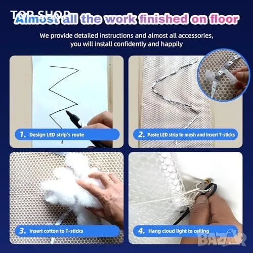 Съдържание на комплекта: 19.8 фута LED лента, памук за 19 кв. фута, 21.5 кв. фута мрежа, ръководство и монтажни аксесоари.
