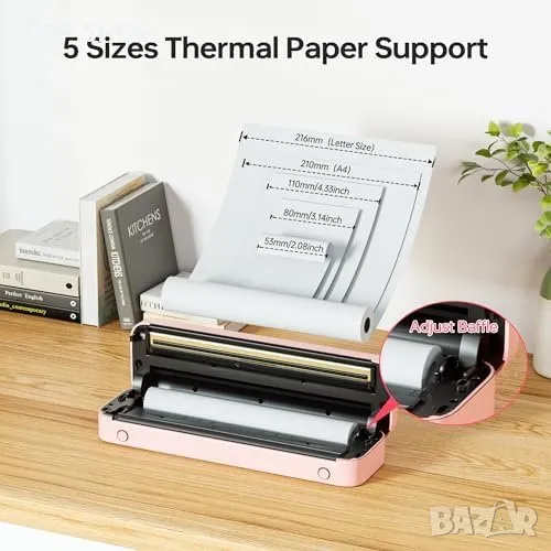 Мултифункционален: Phomemo M832 е безжичен принтер със слот за карта, печата на термохартия с размери 216mm/210mm/110mm/80mm/53mm.