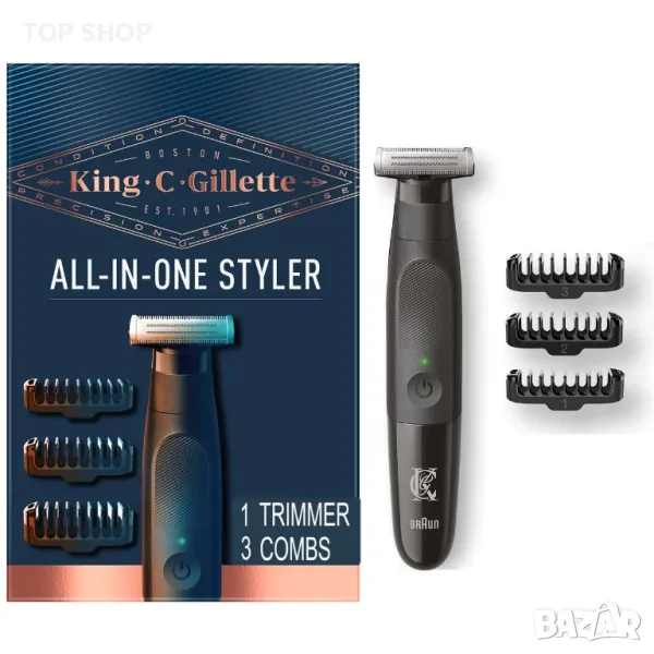 King C. Gillette Style Master е един прост инструмент, който предлага 3 възможности за оформяне на къса брада. Изборът на стил на бръснене като уникално средство за себеизразяване дава възможност за творчество, като много мъже сменят стиловете си в зависимост от случая. С 3 гребена, които ви помагат да оформите индивидуален външен вид, 4 режещи елемента, предназначени за подстригване на различни дължини на косъма, и въртяща се глава, която се адаптира към контурите на лицето, Style Master ви дава гъвкавост, за да овладеете с лекота стила на бръснене. Тънката, компактна дръжка е с 360° гумирана повърхност за чудесен захват и контрол, а освен това е напълно водоустойчива за лесно почистване под течаща вода. С безжично захранване, като едно зареждане осигурява 45 минути подстригване, това е универсален и удобен инструмент за мъже.