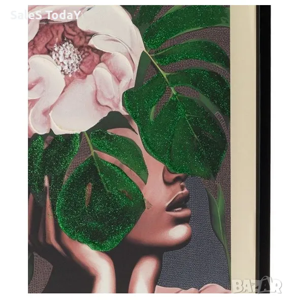 Декоративна картина с черна пластмасова рамка и маслено платно с дизайн на женска фигура с розово цвете и зелени листа с блясък. Дължина x Ширина x Височина 40х60х2,5см